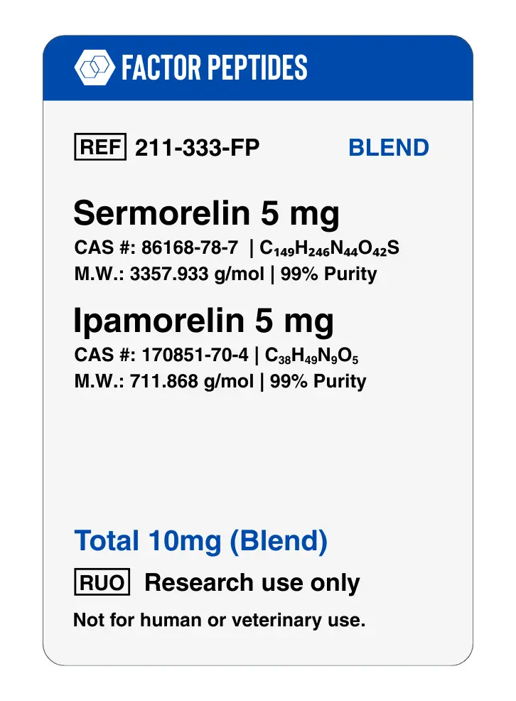 Sermorelin and ipamorelin are supplied for educational and scientific research use only. They are not approved for self-administration, anti-aging programs, performance enhancement, or any therapeutic application outside of properly regulated studies. In animal work, both compounds have shown favorable subcutaneous bioavailability; however, dose-response relationships observed in non-human species do not translate directly to humans. Only qualified, licensed researchers should handle and use these peptides in appropriate laboratory or preclinical environments.